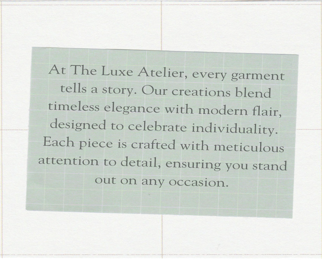 “At The Luxe Atelier, every garment tells a story. Our creations blend timeless elegance with modern flair, designed to celebrate individuality. Each piece is crafted with meticulous attention to detail, ensuring you stand out on any occasion.